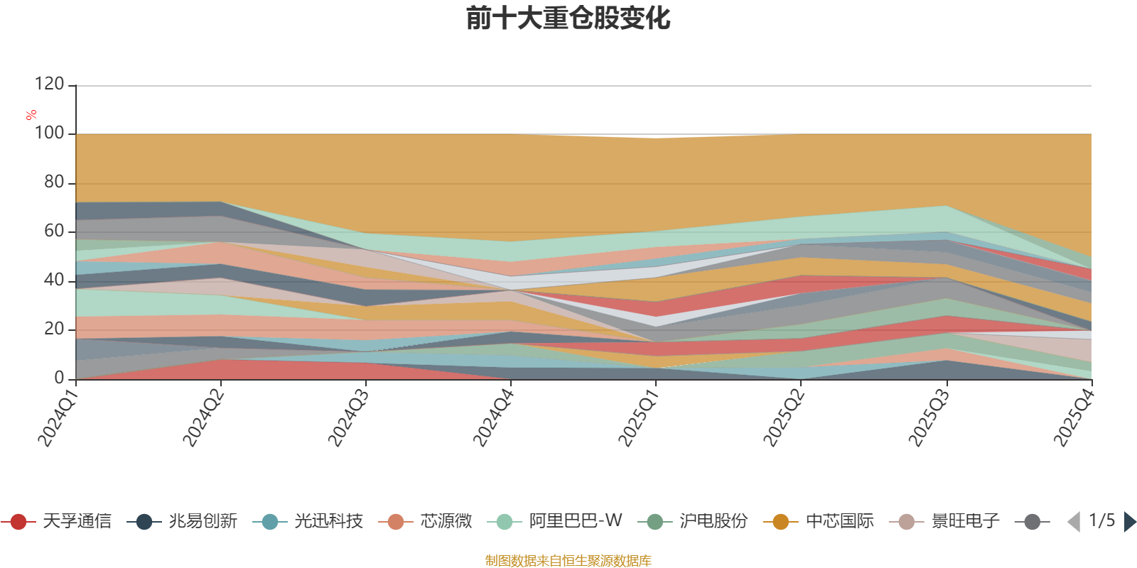 截至2025年末,基金十大重仓股分别是景旺电子、腾讯控股、中材科技、生益科技、立讯精密、中际旭创、新易盛、沪电股份、锐捷网络、阿里巴巴-W。