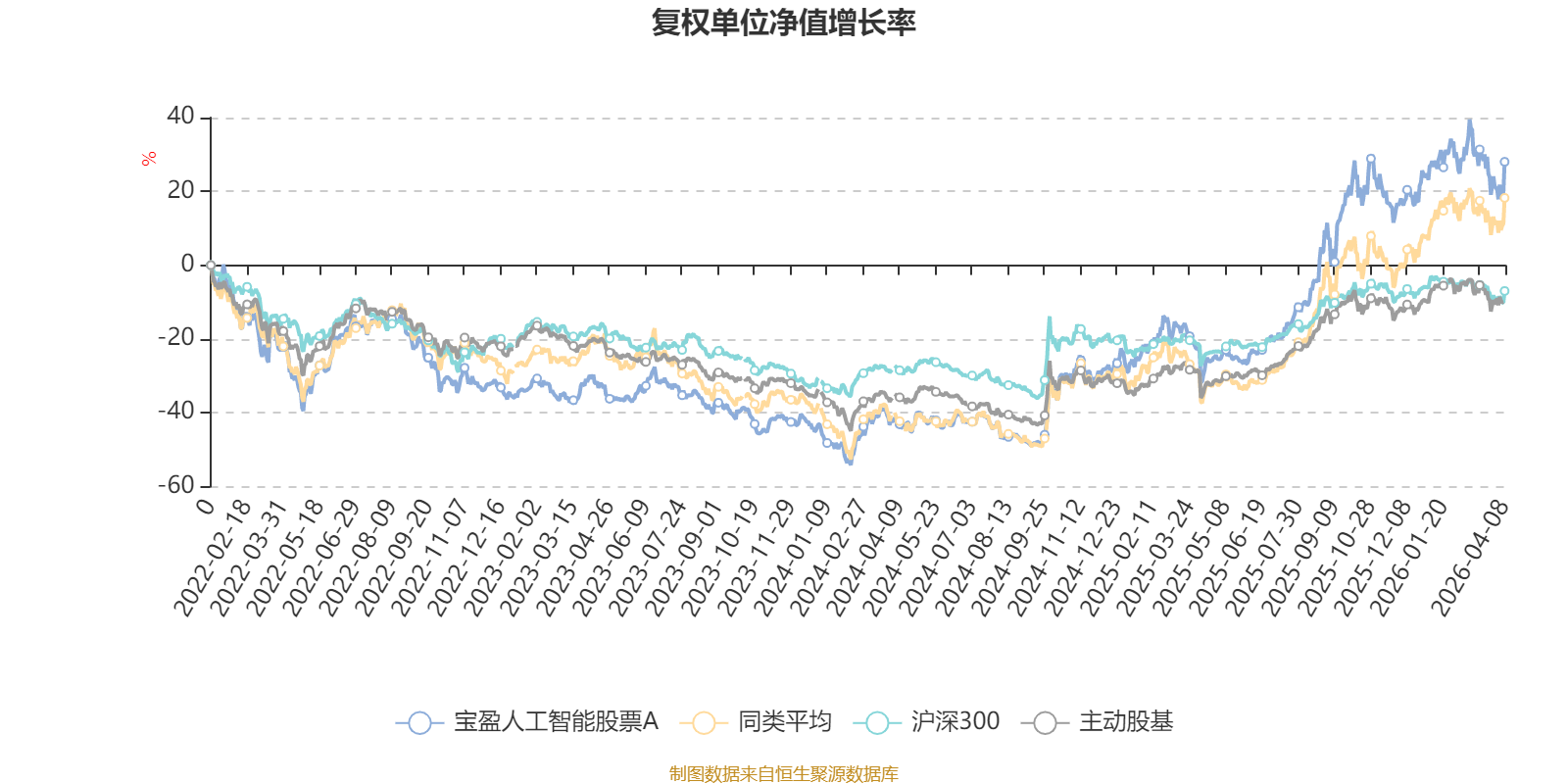 截至4月8日,宝盈人工智能股票A近三个月复权单位净值增长率为1.06%,位于同类可比基金38/63;近半年复权单位净值增长率为1.96%,位于同类可比基金39/63;近一年复权单位净值增长率为87.07%,位于同类可比基金28/63;近三年复权单位净值增长率为82.09%,位于同类可比基金15/53。
