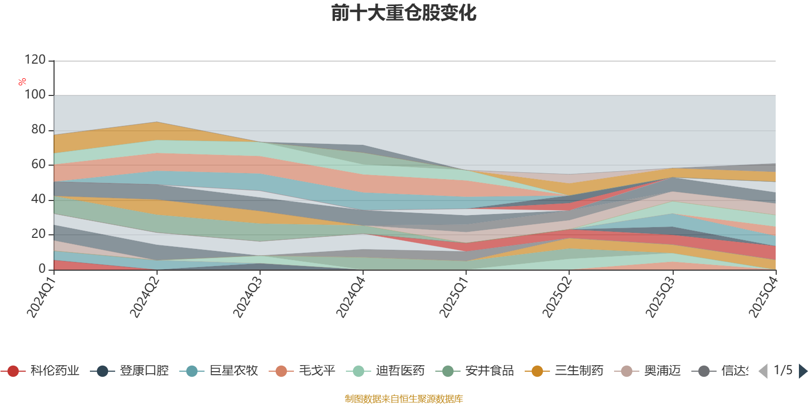 该基金持股集中度较高。截至2025年末,基金十大重仓股分别是东鹏饮料、康方生物、小商品城、联影医疗、伊利股份、科伦博泰生物-B、三生制药、恒瑞医药、若羽臣、稳健医疗。