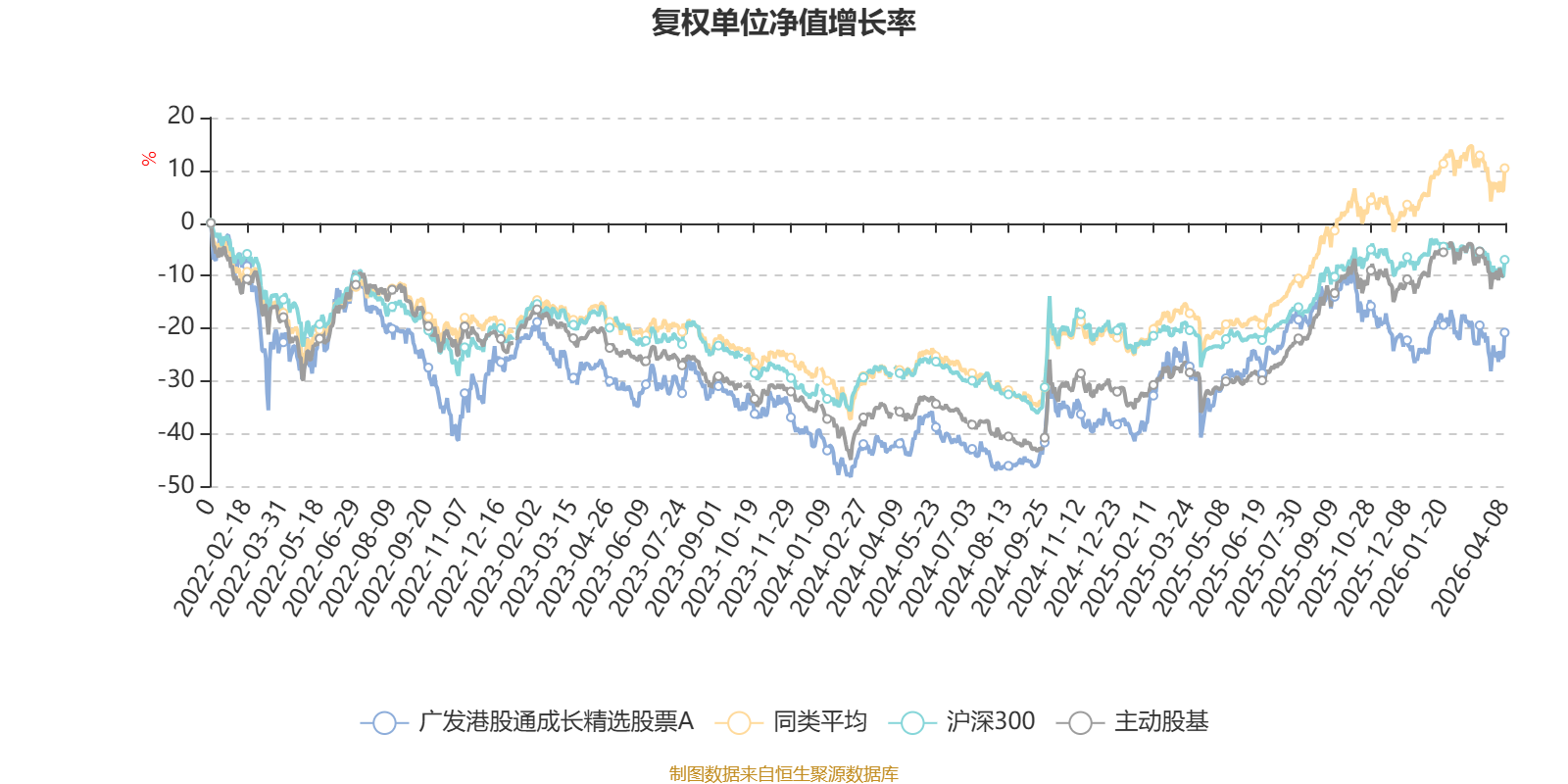 截至4月8日,广发港股通成长精选股票A近三个月复权单位净值增长率为-0.95%,位于同类可比基金40/58;近半年复权单位净值增长率为-13.60%,位于同类可比基金57/58;近一年复权单位净值增长率为30.57%,位于同类可比基金43/57;近三年复权单位净值增长率为9.36%,位于同类可比基金47/57。