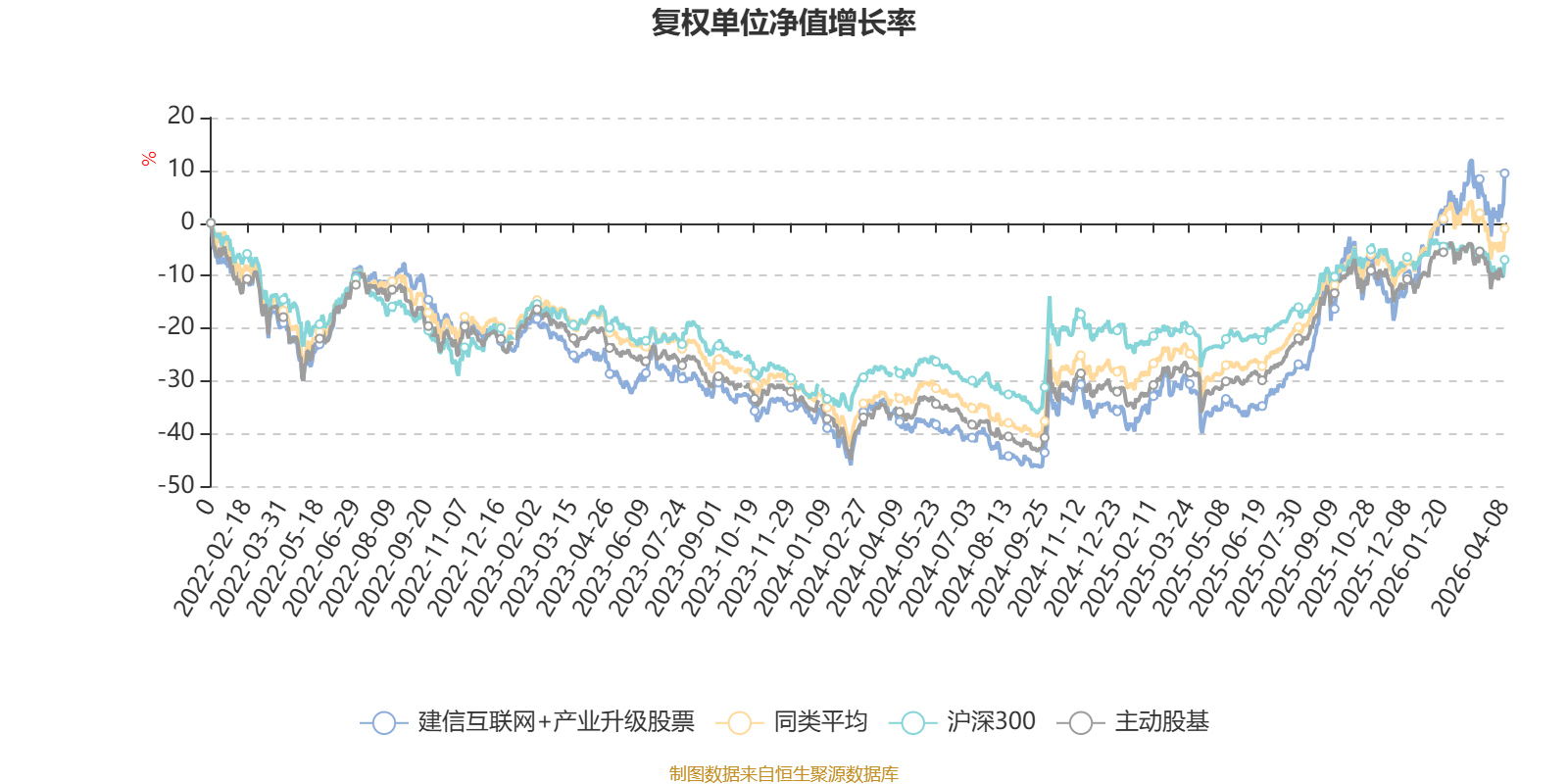截至4月8日,建信互联网+产业升级股票近三个月复权单位净值增长率为10.61%,位于同类可比基金10/167;近半年复权单位净值增长率为14.43%,位于同类可比基金19/167;近一年复权单位净值增长率为81.88%,位于同类可比基金16/165;近三年复权单位净值增长率为44.53%,位于同类可比基金26/157。