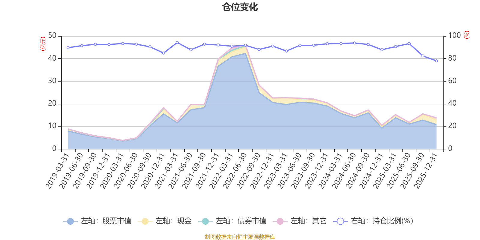 据定期报告数据统计,近三年平均股票仓位为89.61%,同类平均为88.27%。2021年一季度末基金达到94.25%的最高仓位,2025年末最低,为77.97%。
