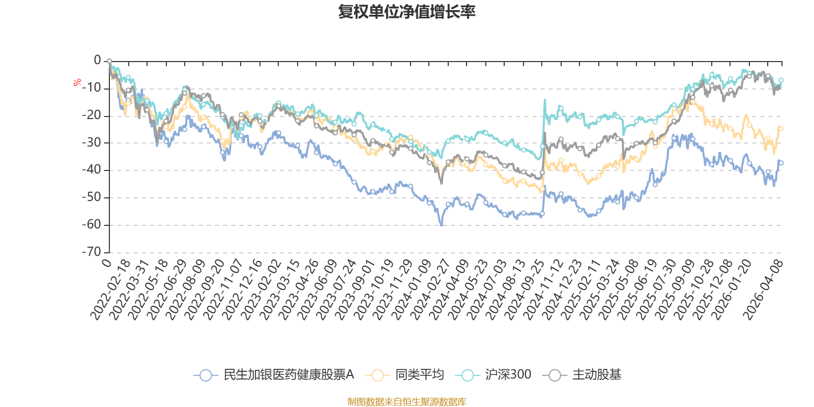 截至4月8日,民生加银医药健康股票A近三个月复权单位净值增长率为-3.22%,位于同类可比基金25/57;近半年复权单位净值增长率为-8.50%,位于同类可比基金17/57;近一年复权单位净值增长率为35.36%,位于同类可比基金15/57;近三年复权单位净值增长率为-8.61%,位于同类可比基金25/48。