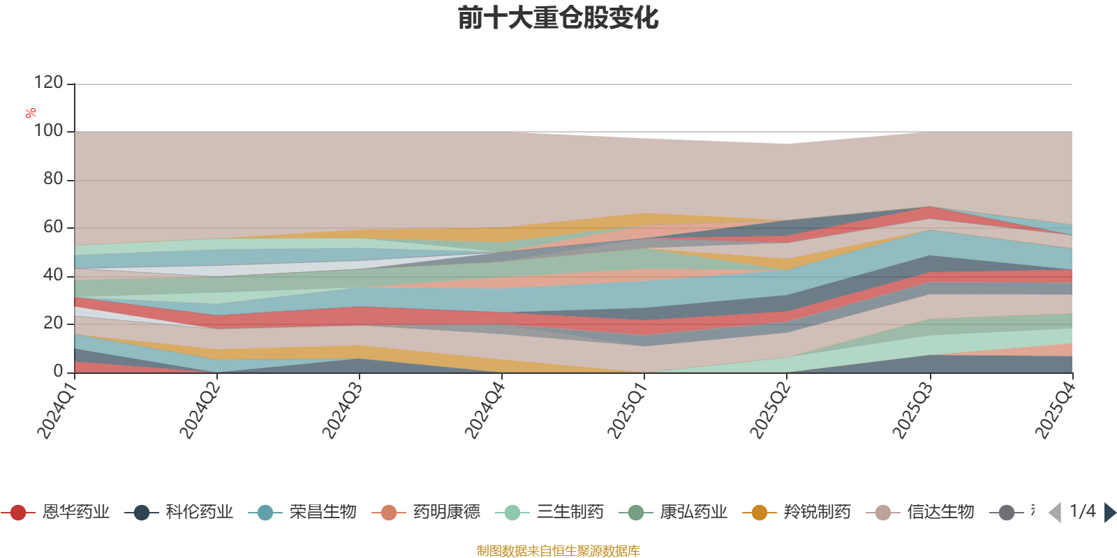 该基金持股集中度较高。截至2025年末,基金十大重仓股分别是康方生物、信达生物、科伦药业、康弘药业、三生制药、华东医药、泰格医药、药明康德、百济神州、福瑞医科。