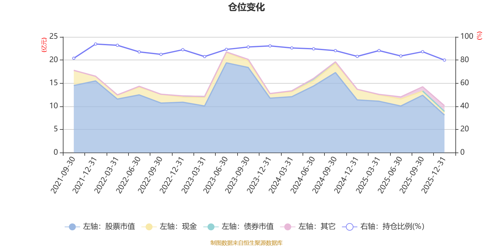 据定期报告数据统计,近三年平均股票仓位为87.18%,同类平均为86.12%。2021年末基金达到93.85%的最高仓位,2025年末最低,为80%。