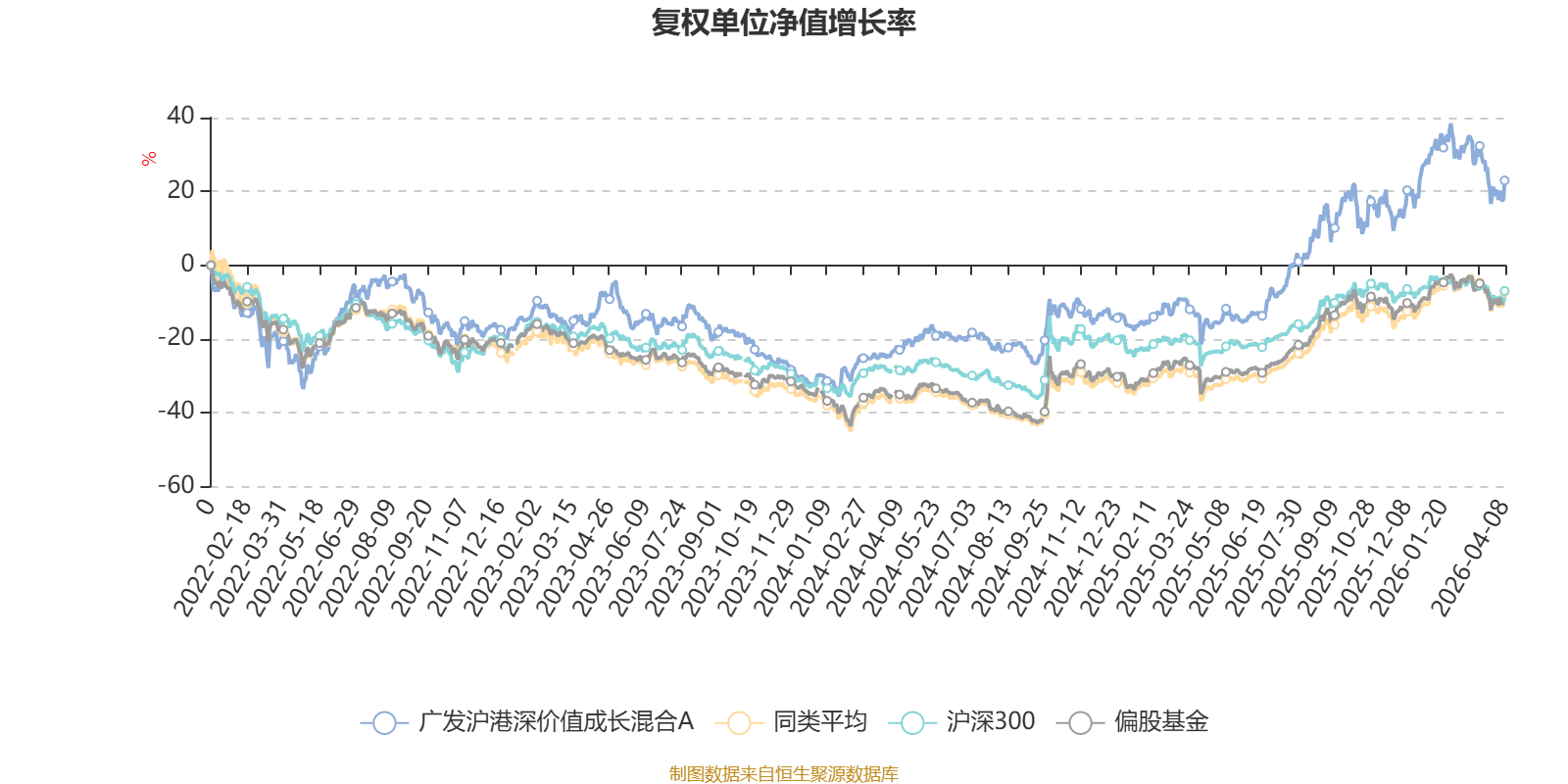截至4月8日,广发沪港深价值成长混合A近三个月复权单位净值增长率为-6.51%,位于同类可比基金239/265;近半年复权单位净值增长率为0.83%,位于同类可比基金139/265;近一年复权单位净值增长率为54.38%,位于同类可比基金83/265;近三年复权单位净值增长率为43.46%,位于同类可比基金33/261。