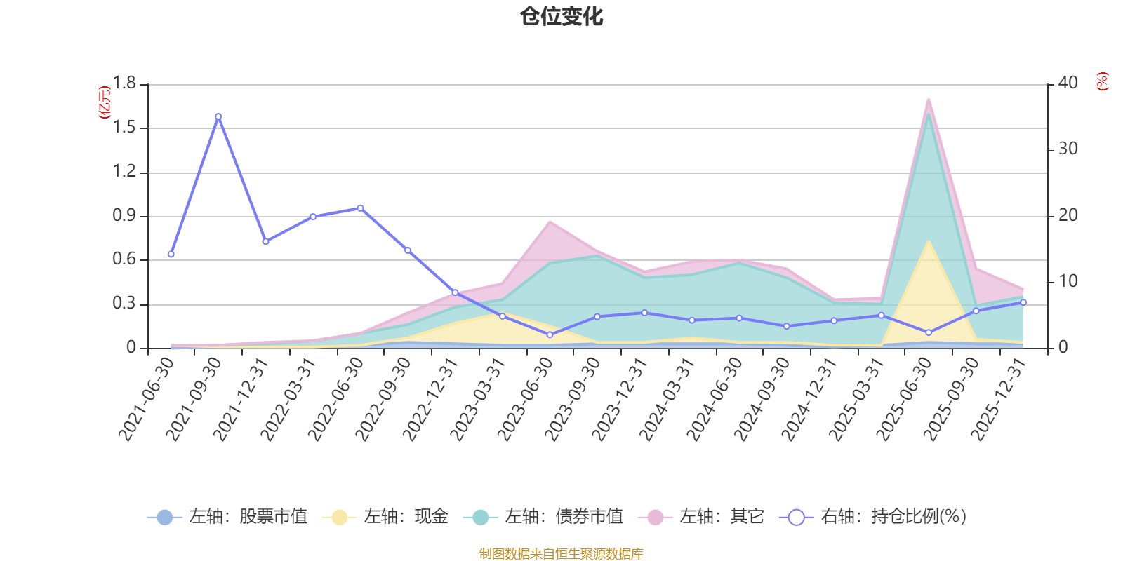 据定期报告数据统计,近三年平均股票仓位为4.44%,同类平均为19.2%。2021年三季度末基金达到35.1%的最高仓位,2023年上半年末最低,为2.04%。