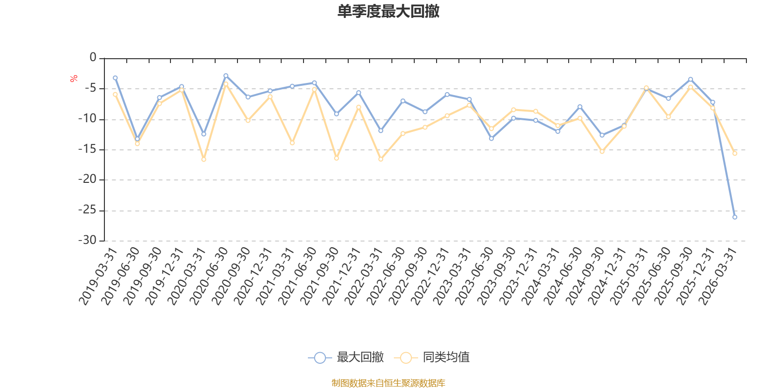 截至4月8日,基金近三年最大回撤为35.26%,同类可比基金排名23/30。单季度最大回撤出现在2026年一季度,为26.11%。