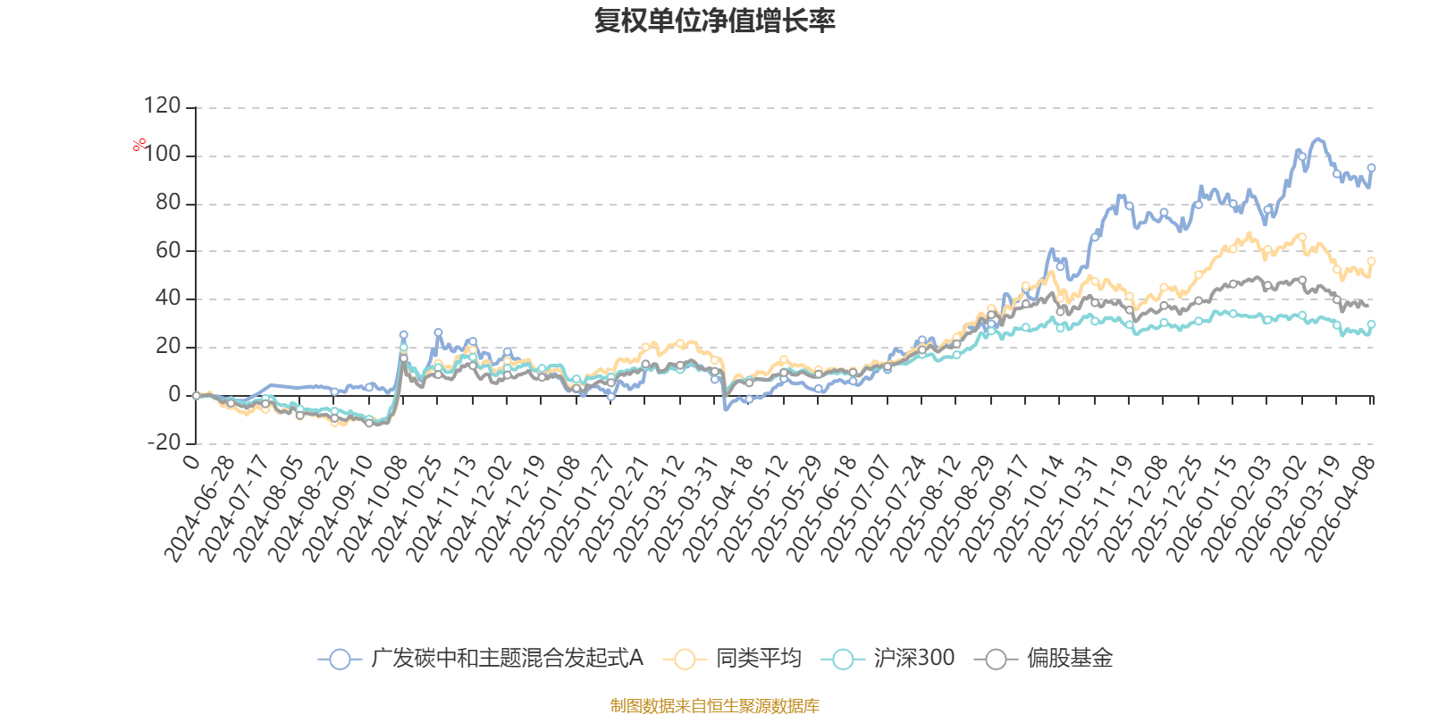截至4月8日,广发碳中和主题混合发起式A近三个月复权单位净值增长率为7.89%,位于同类可比基金9/100;近半年复权单位净值增长率为22.34%,位于同类可比基金8/100;近一年复权单位净值增长率为105.17%,位于同类可比基金1/99。