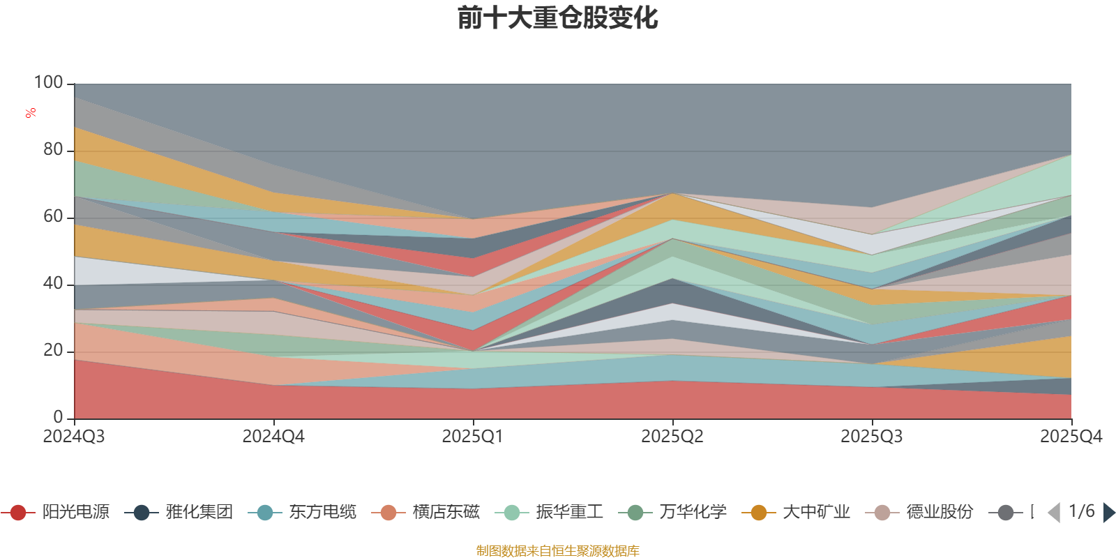 该基金持股集中度较高。截至2025年末,基金十大重仓股分别是大中矿业、天华新能、中矿资源、盛新锂能、阳光电源、佛塑科技、恩捷股份、鹏辉能源、国城矿业、雅化集团。