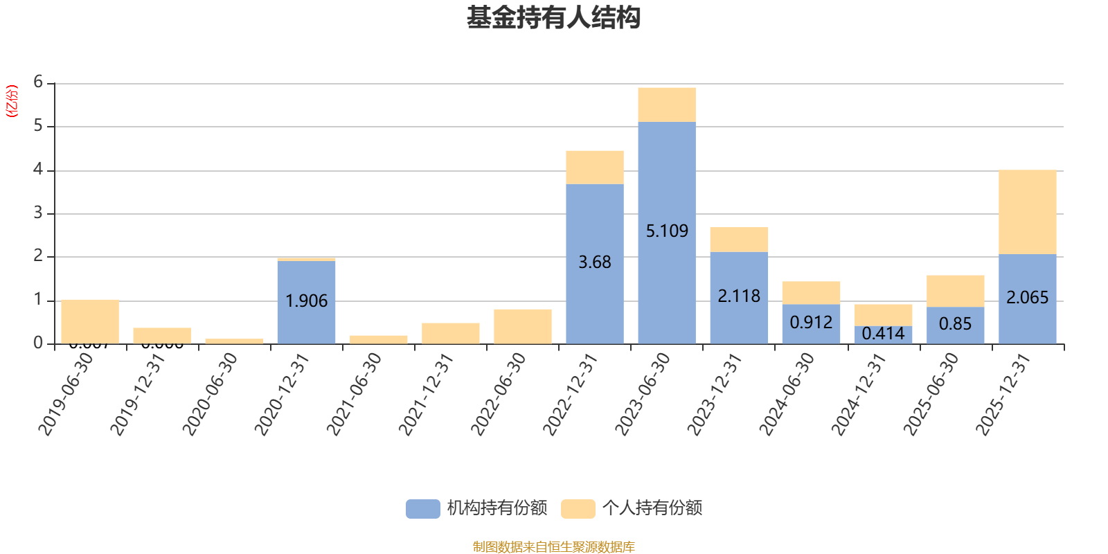 截至2025年12月31日,基金持有人共计2969户,合计持有4亿份。其中管理人员工持有499.05万份,占比1.25%,机构持有份额占比51.58%,个人投资者占比48.42%。