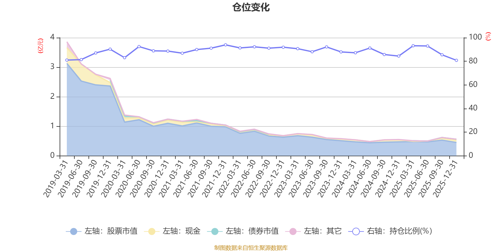 据定期报告数据统计,近三年平均股票仓位为88.31%,同类平均为72.57%。2021年末基金达到93.91%的最高仓位,2025年末最低,为80.81%。