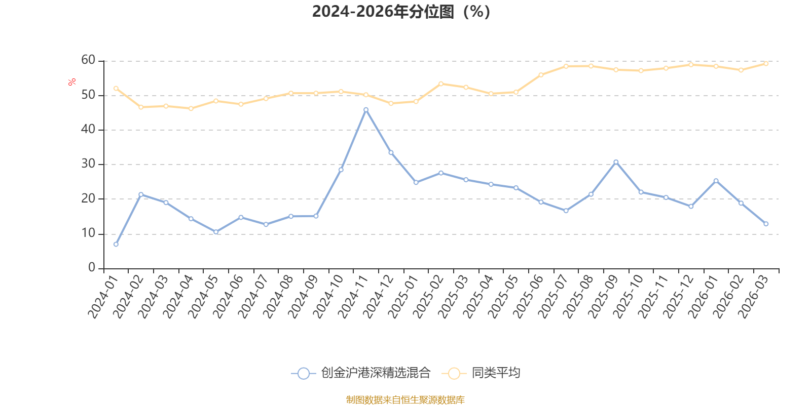通过所选区间该基金净值增长率分位图,可以观察该基金与同类基金业绩比较情况。图为坐标原点到区间内某时点的净值增长率在同类基金中的分位数。