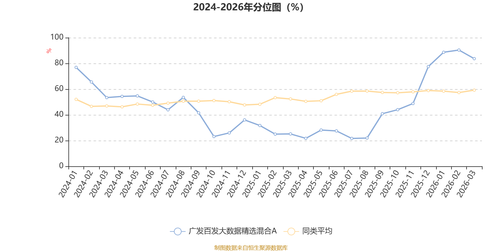 通过所选区间该基金净值增长率分位图,可以观察该基金与同类基金业绩比较情况。图为坐标原点到区间内某时点的净值增长率在同类基金中的分位数。