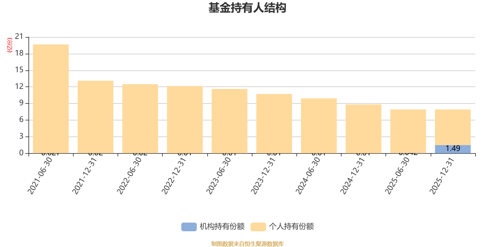 截至2025年12月31日,基金持有人共计6.6万户,合计持有7.93亿份。其中管理人员工持有75.75万份,占比0.10%,机构持有份额占比18.80%,个人投资者占比81.20%。