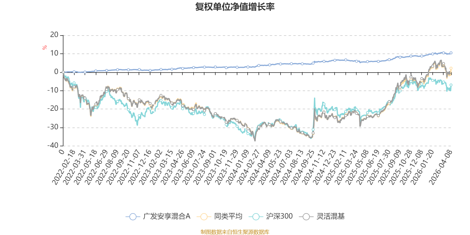 截至4月8日,广发安享混合A近三个月复权单位净值增长率为0.74%,位于同类可比基金556/1287;近半年复权单位净值增长率为2.08%,位于同类可比基金694/1286;近一年复权单位净值增长率为5.04%,位于同类可比基金1182/1286;近三年复权单位净值增长率为8.20%,位于同类可比基金774/1286。