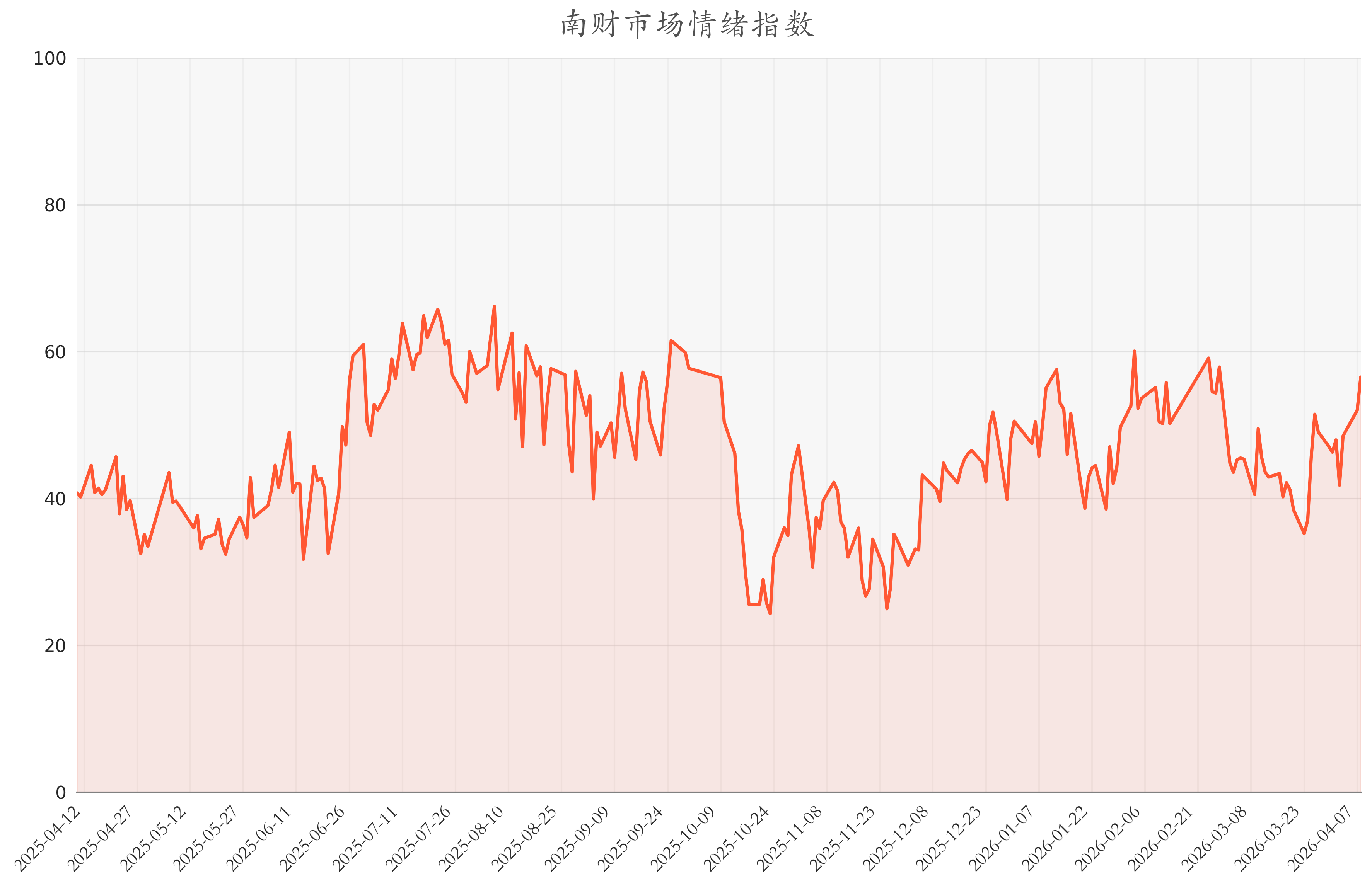 今日南财市场情绪指数为56.55,市场投资热度提升