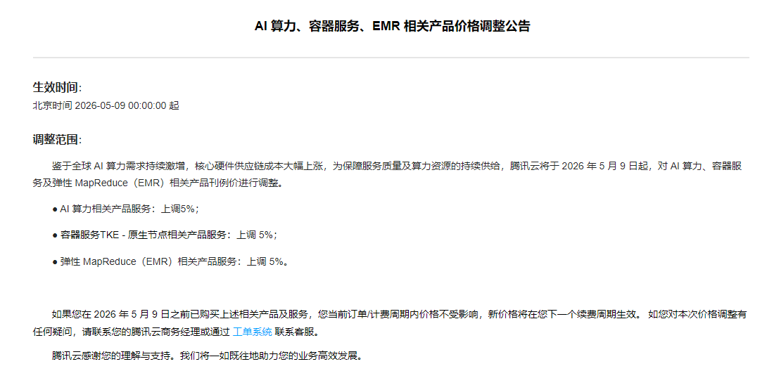 上调5%!腾讯云宣布AI算力等产品价格调整