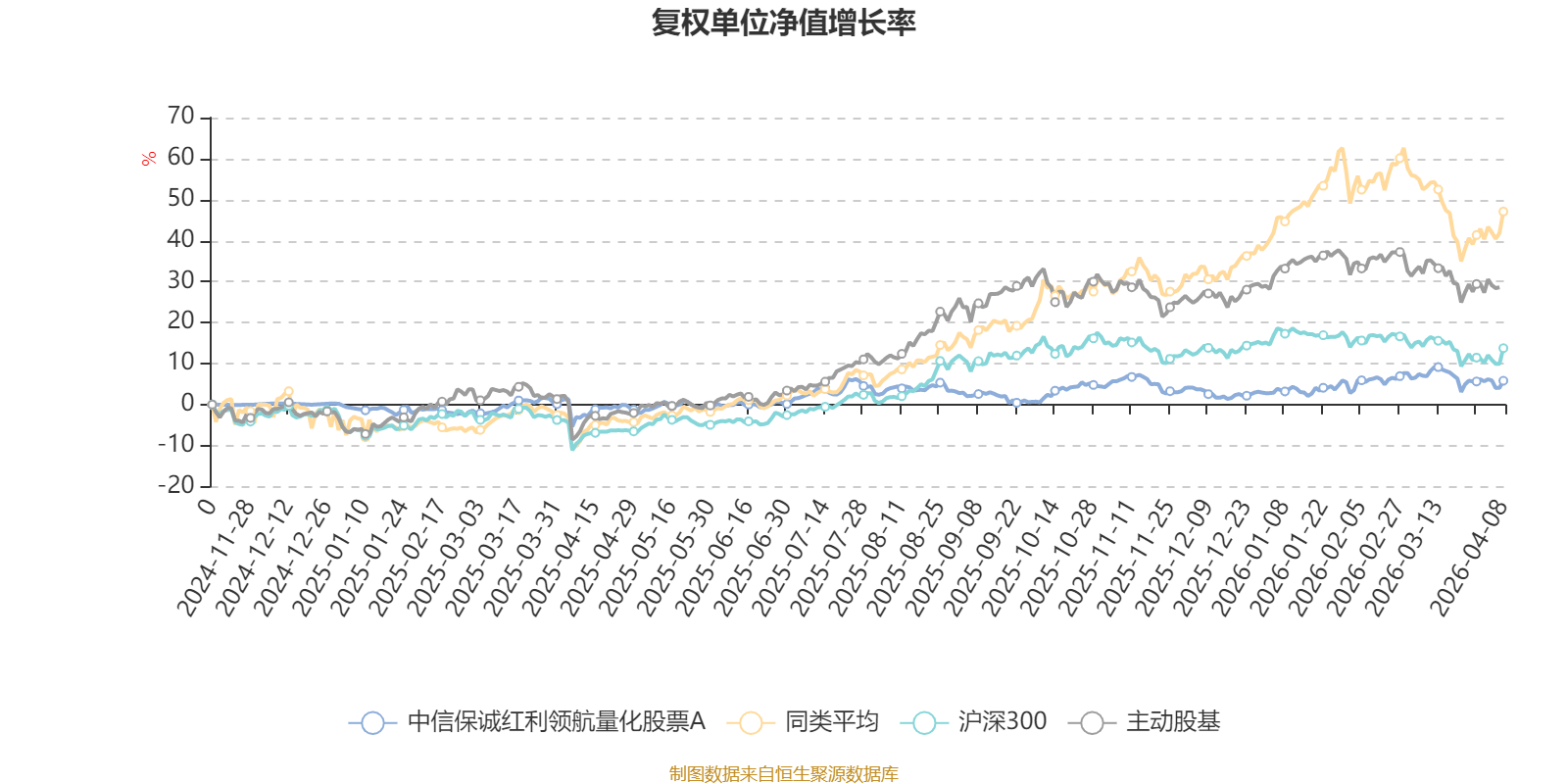 截至4月8日,中信保诚红利领航量化股票A近三个月复权单位净值增长率为2.53%,位于同类可比基金8/13;近半年复权单位净值增长率为5.23%,位于同类可比基金8/13;近一年复权单位净值增长率为9.17%,位于同类可比基金12/13。