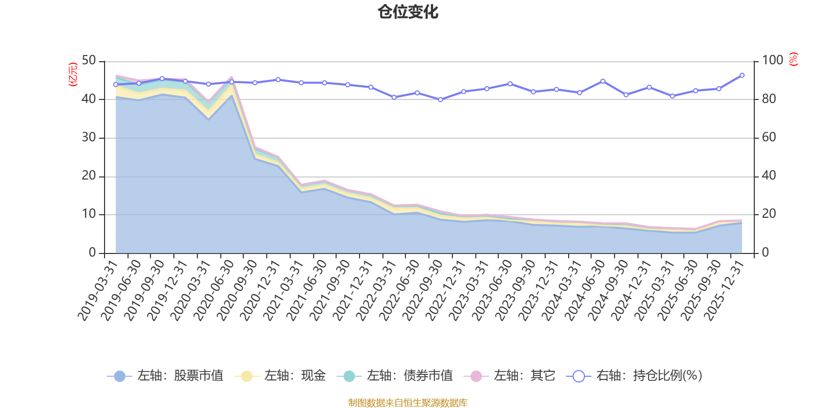 据定期报告数据统计,近三年平均股票仓位为85.86%,同类平均为88.27%。2025年末基金达到92.69%的最高仓位,2022年三季度末最低,为79.99%。