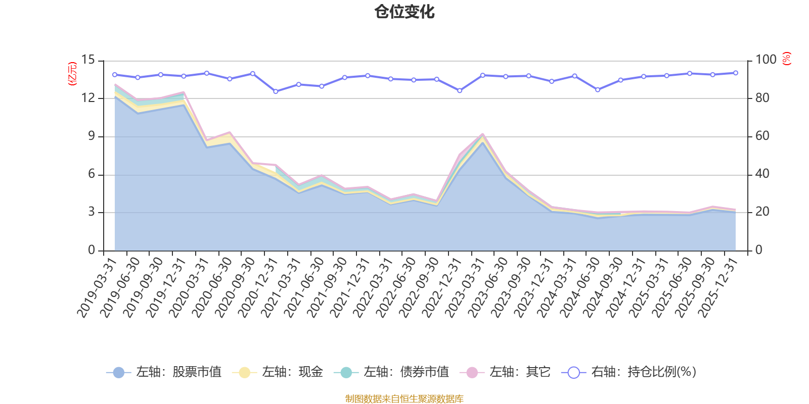 据定期报告数据统计,近三年平均股票仓位为91.21%,同类平均为88.27%。2025年末基金达到93.54%的最高仓位,2020年末最低,为83.77%。