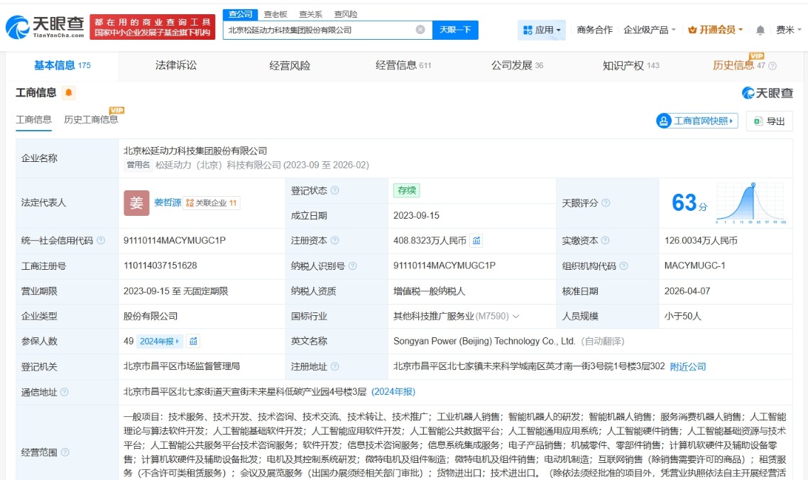 每经AI快讯,天眼查工商信息显示,近日,北京松延动力科技集团股份有限公司发生工商变更,注册资本由约324.6万元人民币增至约409万元人民币,增幅约26%。该公司成立于2023年9月,法定代表人为姜哲源,经营范围包括工业机器人销售、智能机器人的研发、智能机器人销售等。股东信息显示,该公司由姜哲源、张世璞、北京机器人产业发展投资基金(有限合伙)等共同持股。变更记录显示,去年2月以来,该公司已多次增资。