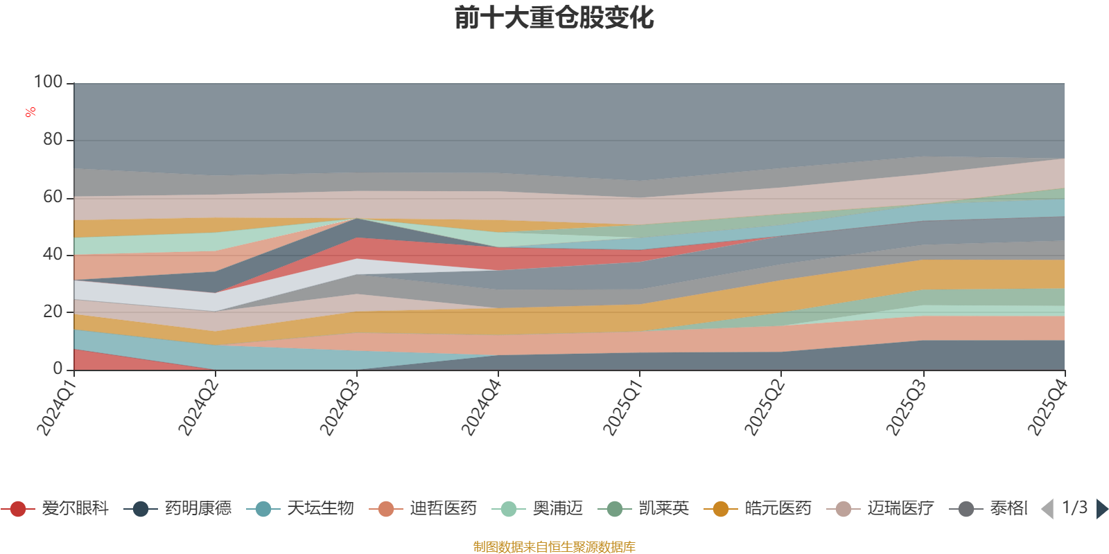 该基金持股集中度较高,近2年前十大重仓股集中度长期超过60%。截至2025年末,基金十大重仓股分别是恒瑞医药、药明康德、皓元医药、迪哲医药、泽璟制药、泰格医药、康龙化成、凯莱英、华大智造、奥浦迈。