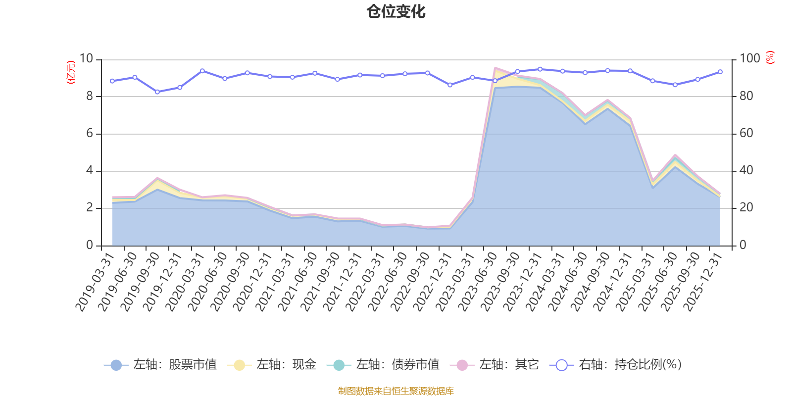 据定期报告数据统计,近三年平均股票仓位为91.59%,同类平均为88.36%。2023年末基金达到94.77%的最高仓位,2019年三季度末最低,为82.57%。