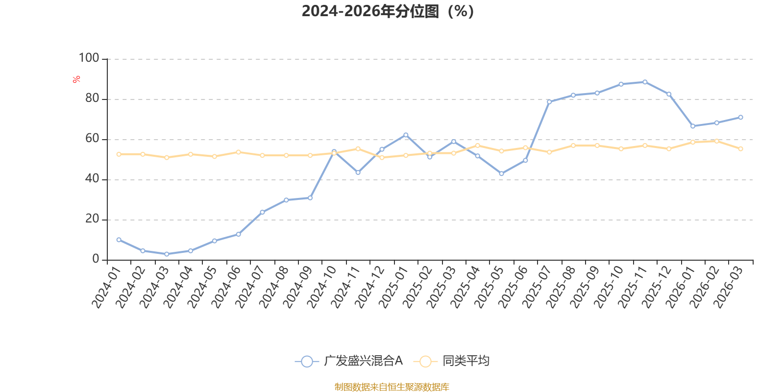 通过所选区间该基金净值增长率分位图,可以观察该基金与同类基金业绩比较情况。图为坐标原点到区间内某时点的净值增长率在同类基金中的分位数。