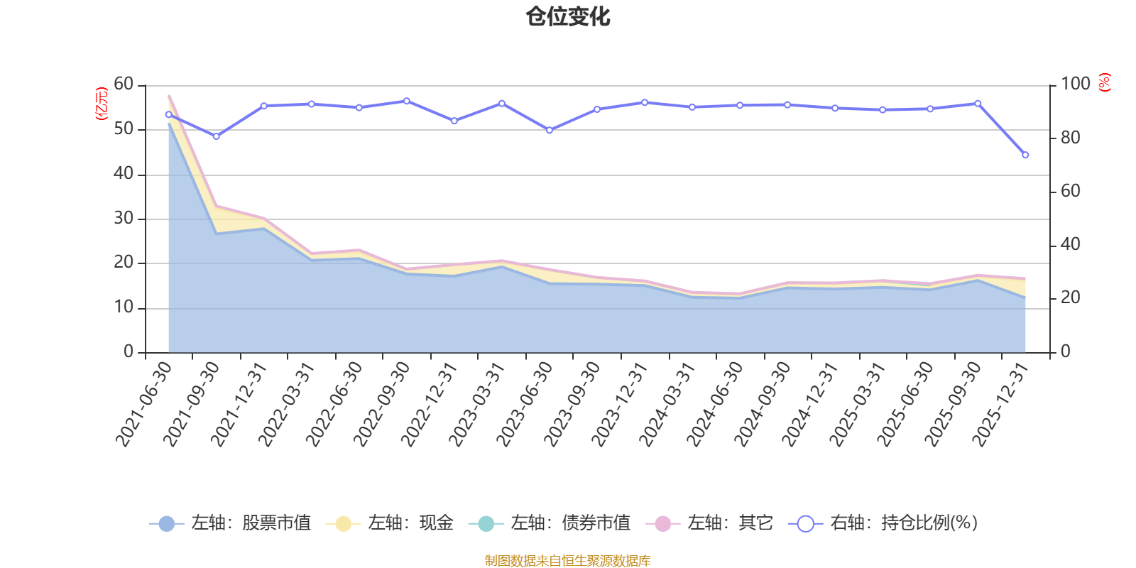 据定期报告数据统计,近三年平均股票仓位为89.86%,同类平均为87.64%。2022年三季度末基金达到94.1%的最高仓位,2025年末最低,为73.94%。