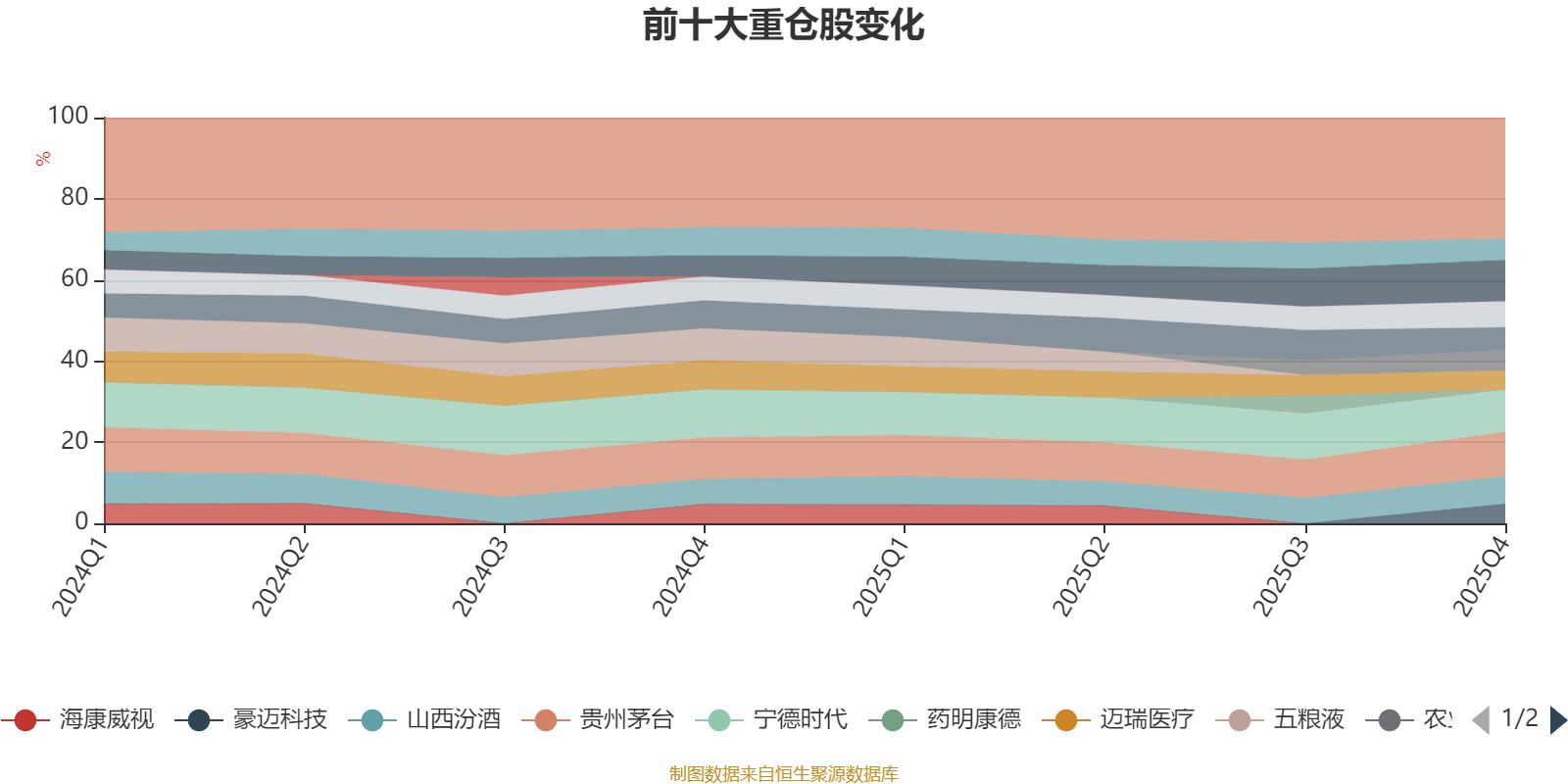 该基金持股集中度较高,且持股标的较为稳定,近2年前十大重仓股集中度长期超过60%。截至2025年末,基金十大重仓股分别是贵州茅台、宁德时代、腾讯控股、山西汾酒、星宇股份、海大集团、亿联网络、农业银行、豪迈科技、迈瑞医疗。