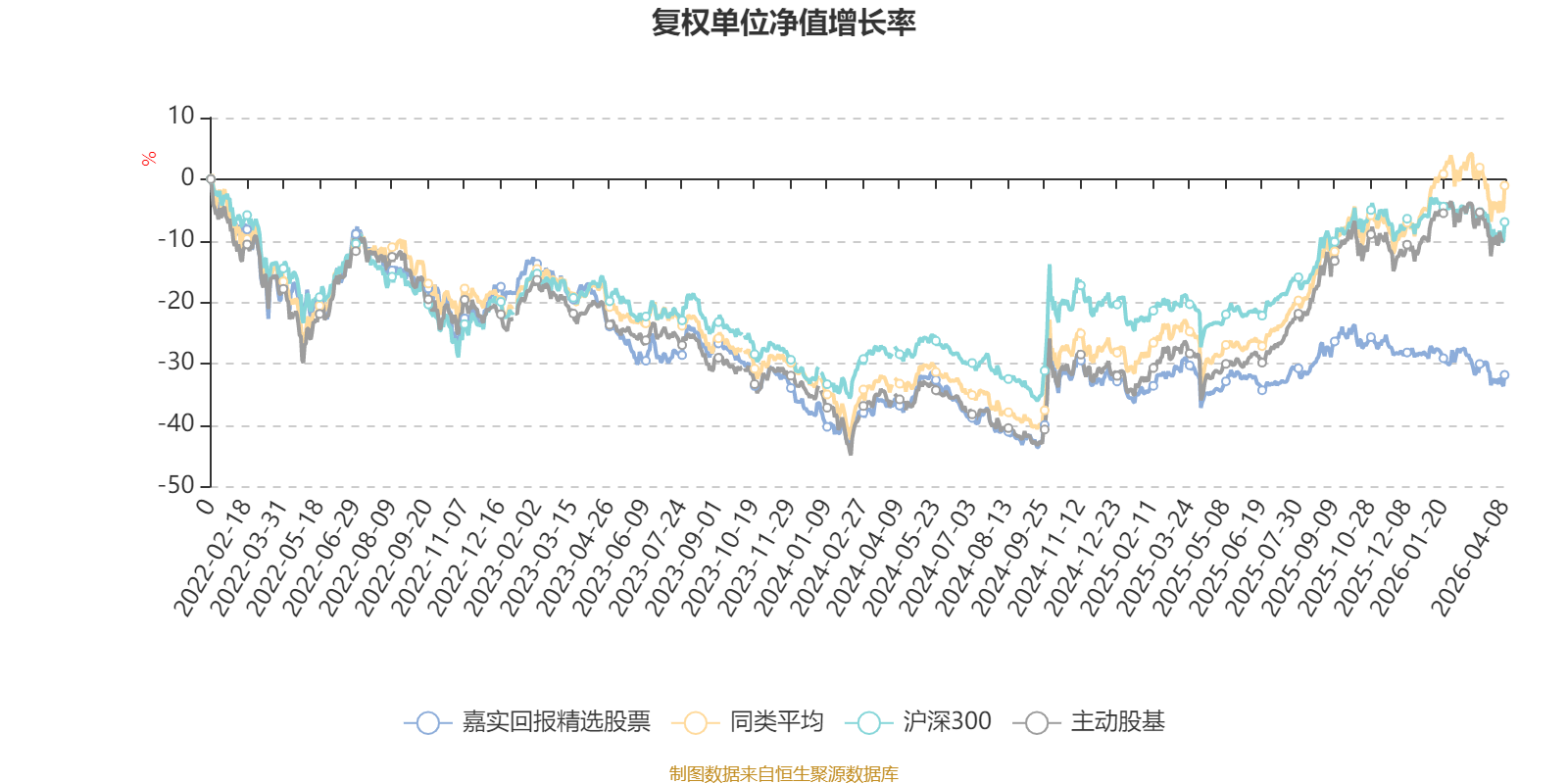 截至4月8日,嘉实回报精选股票近三个月复权单位净值增长率为-4.98%,位于同类可比基金132/167;近半年复权单位净值增长率为-10.48%,位于同类可比基金154/167;近一年复权单位净值增长率为6.94%,位于同类可比基金159/165;近三年复权单位净值增长率为-16.78%,位于同类可比基金148/157。