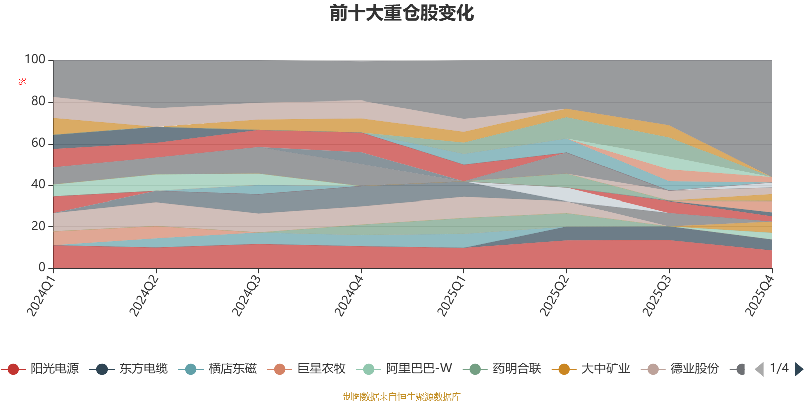 截至2025年末,基金十大重仓股分别是阳光电源、鹏辉能源、大中矿业、东方电缆、阿里巴巴-W、方大特钢、天康生物、燕京啤酒、福莱特、腾讯控股、福莱特玻璃。