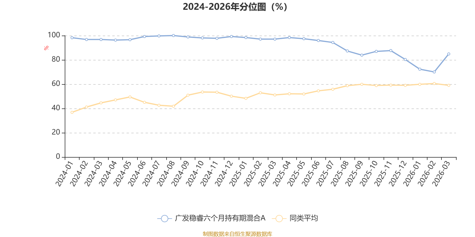 通过所选区间该基金净值增长率分位图,可以观察该基金与同类基金业绩比较情况。图为坐标原点到区间内某时点的净值增长率在同类基金中的分位数。