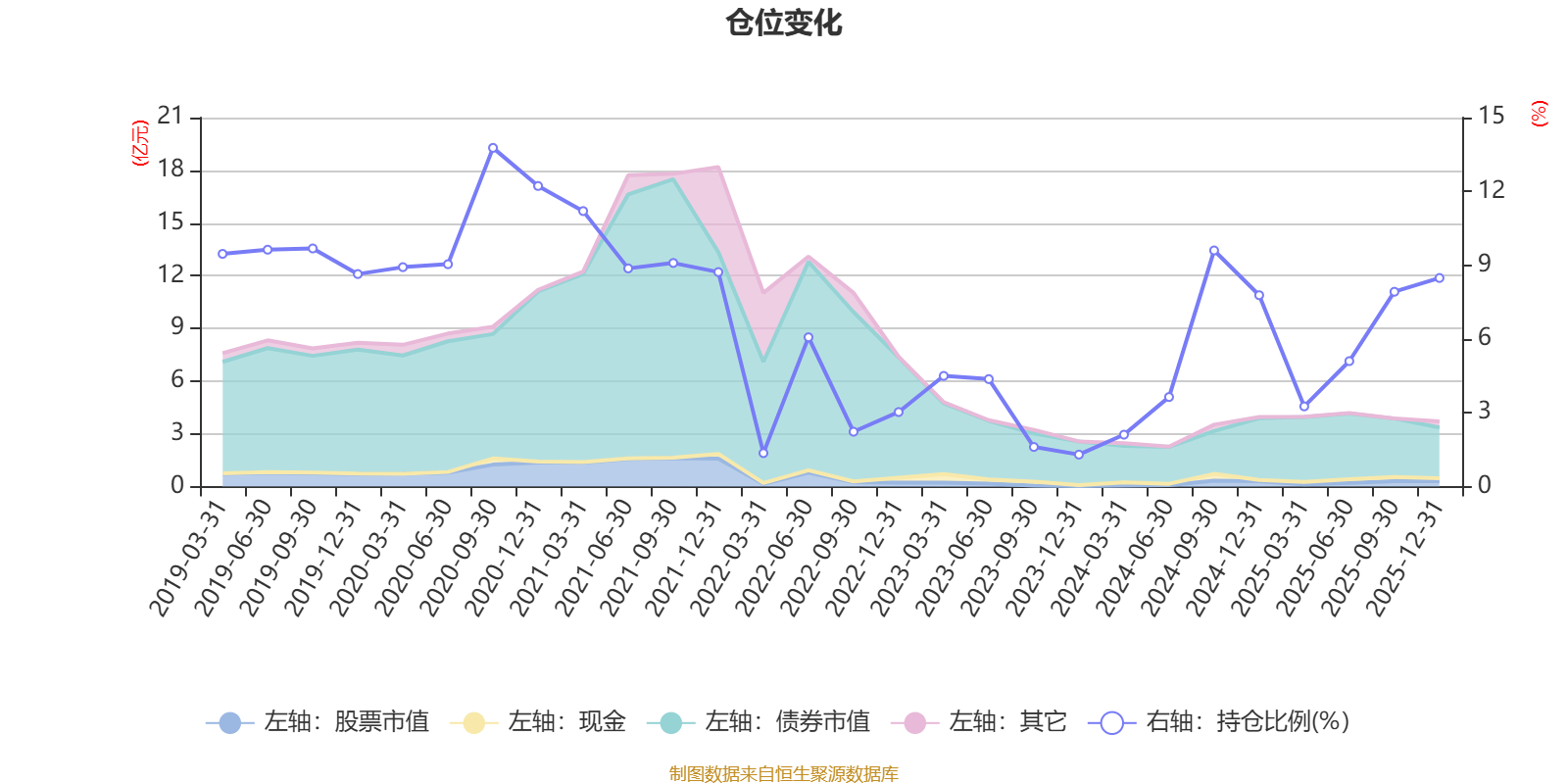 据定期报告数据统计,近三年平均股票仓位为4.97%,同类平均为72.57%。2020年三季度末基金达到13.77%的最高仓位,2023年末最低,为1.3%。
