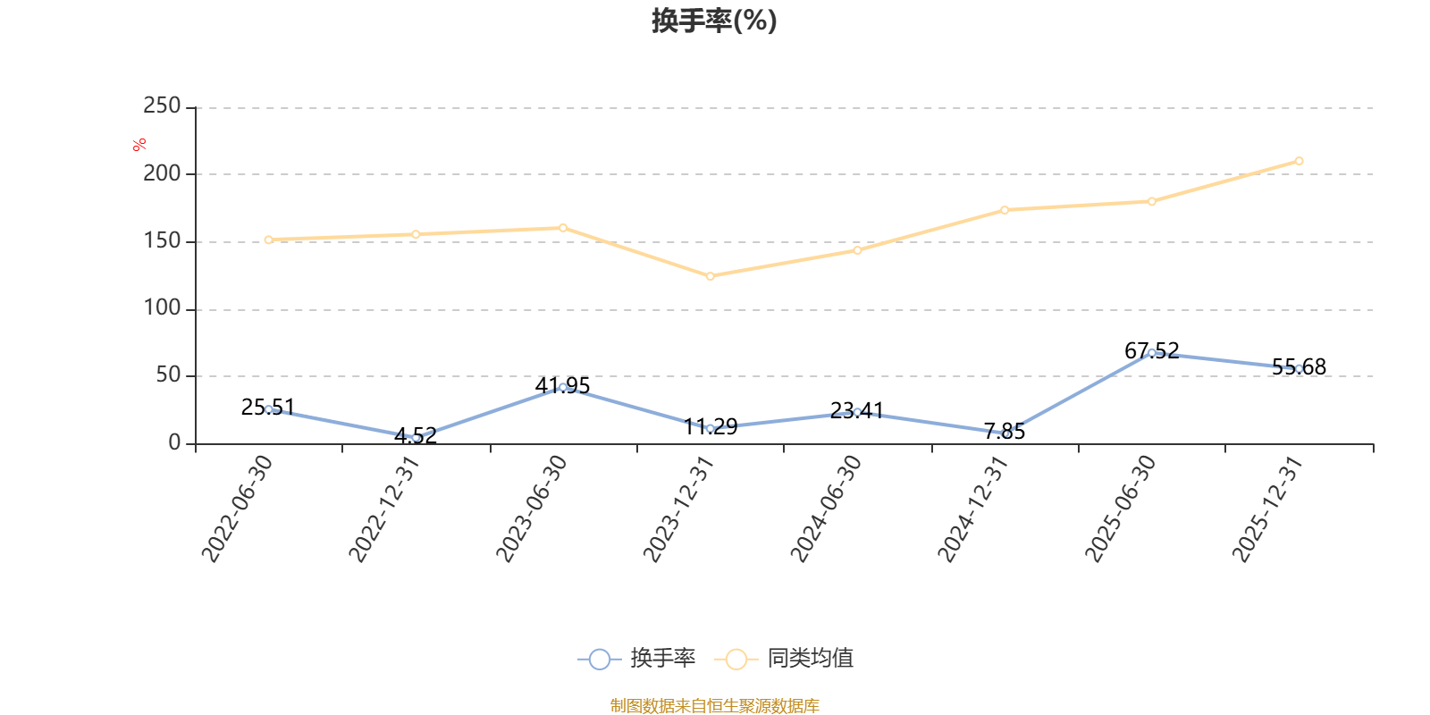 截至2025年12月31日,基金最近一年换手率约121.24%,持续低于同类均值。