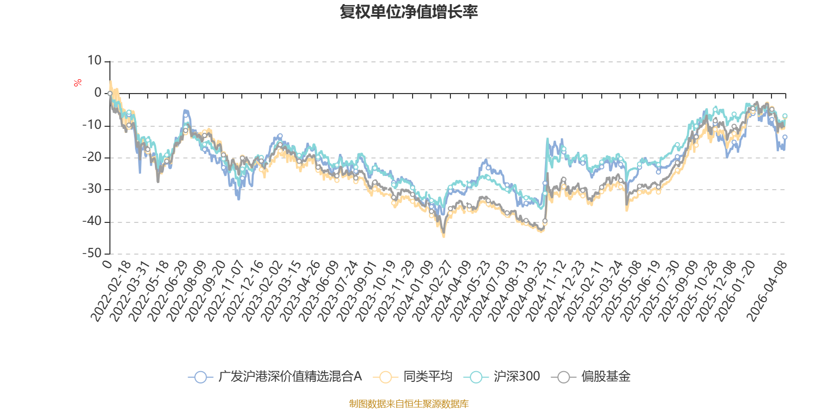 截至4月8日,广发沪港深价值精选混合A近三个月复权单位净值增长率为-6.71%,位于同类可比基金243/265;近半年复权单位净值增长率为-8.85%,位于同类可比基金243/265;近一年复权单位净值增长率为24.89%,位于同类可比基金210/265;近三年复权单位净值增长率为3.32%,位于同类可比基金196/261。