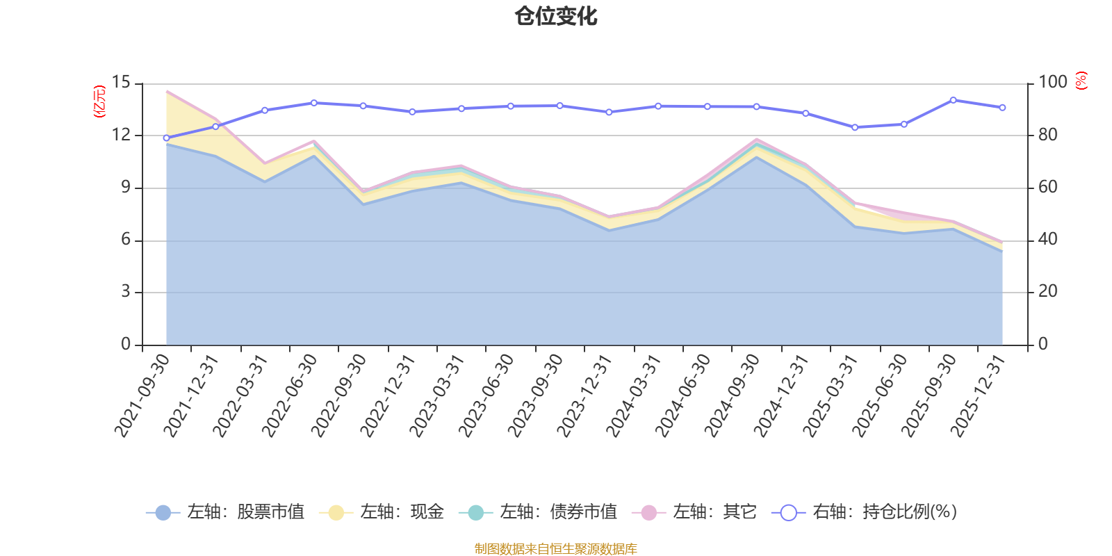 据定期报告数据统计,近三年平均股票仓位为89.7%,同类平均为86.12%。2025年三季度末基金达到93.62%的最高仓位,2021年三季度末最低,为79.16%。