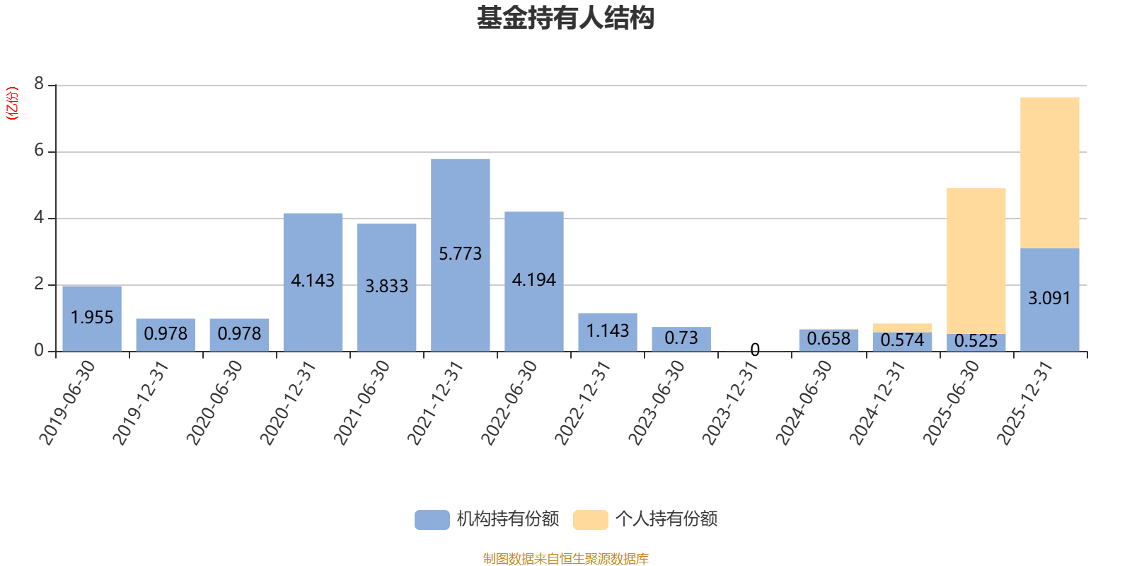 截至2025年12月31日,基金持有人共计4326户,合计持有7.63亿份。其中管理人员工持有290.63万份,占比0.38%,机构持有份额占比40.53%,个人投资者占比59.47%。