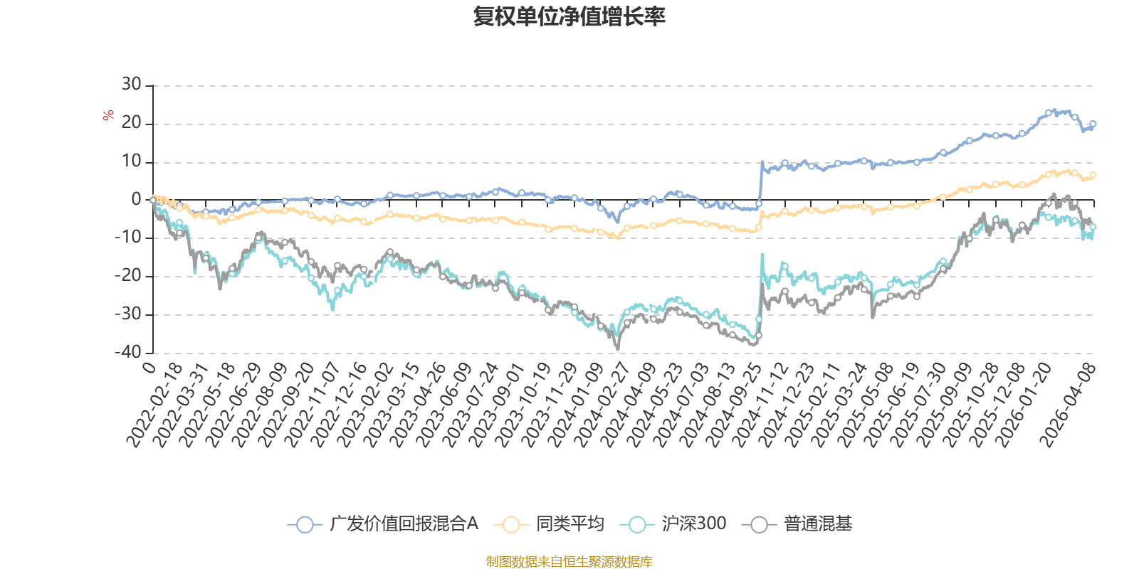截至4月8日,广发价值回报混合A近三个月复权单位净值增长率为-1.15%,位于同类可比基金559/629;近半年复权单位净值增长率为2.54%,位于同类可比基金185/629;近一年复权单位净值增长率为10.81%,位于同类可比基金167/629;近三年复权单位净值增长率为17.91%,位于同类可比基金96/581。