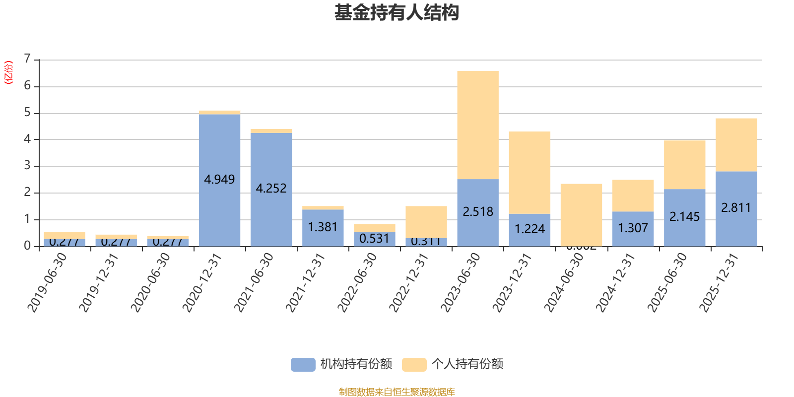 截至2025年12月31日,基金持有人共计1.29万户,合计持有4.8亿份。其中管理人员工持有112.13万份,占比0.23%,机构持有份额占比58.61%,个人投资者占比41.39%。