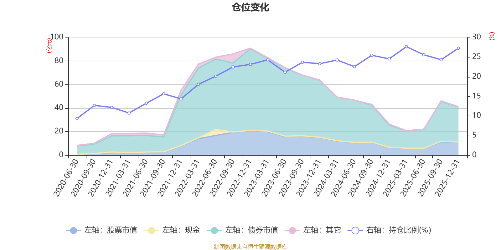 据定期报告数据统计,近三年平均股票仓位为24.52%,同类平均为19.2%。2025年一季度末基金达到27.67%的最高仓位,2020年上半年末最低,为9.33%。