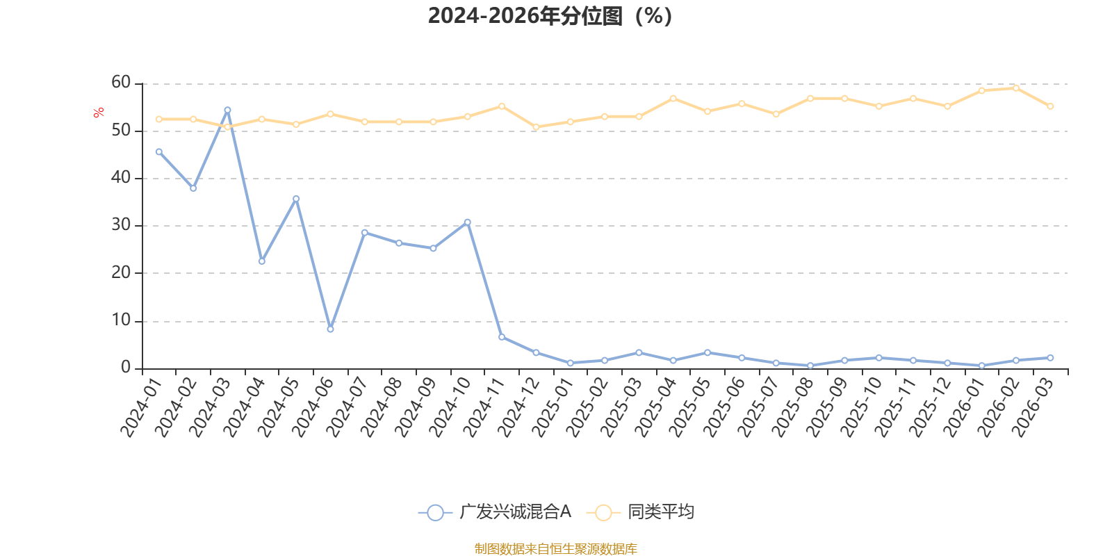 通过所选区间该基金净值增长率分位图,可以观察该基金与同类基金业绩比较情况。图为坐标原点到区间内某时点的净值增长率在同类基金中的分位数。