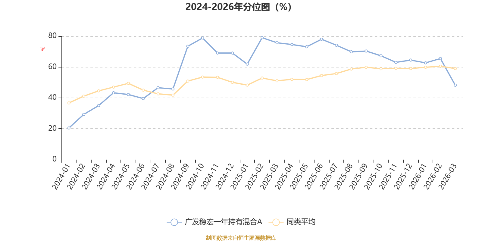 通过所选区间该基金净值增长率分位图,可以观察该基金与同类基金业绩比较情况。图为坐标原点到区间内某时点的净值增长率在同类基金中的分位数。