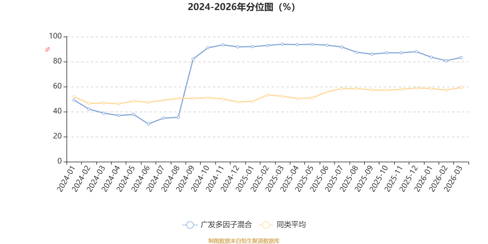 通过所选区间该基金净值增长率分位图,可以观察该基金与同类基金业绩比较情况。图为坐标原点到区间内某时点的净值增长率在同类基金中的分位数。