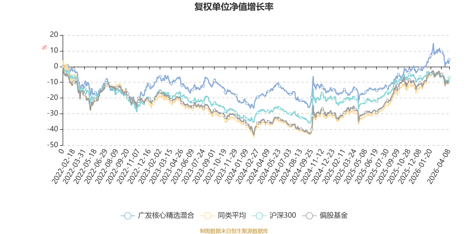截至4月8日,广发核心精选混合近三个月复权单位净值增长率为2.03%,位于同类可比基金87/265;近半年复权单位净值增长率为8.53%,位于同类可比基金68/265;近一年复权单位净值增长率为32.26%,位于同类可比基金177/265;近三年复权单位净值增长率为12.24%,位于同类可比基金158/261。