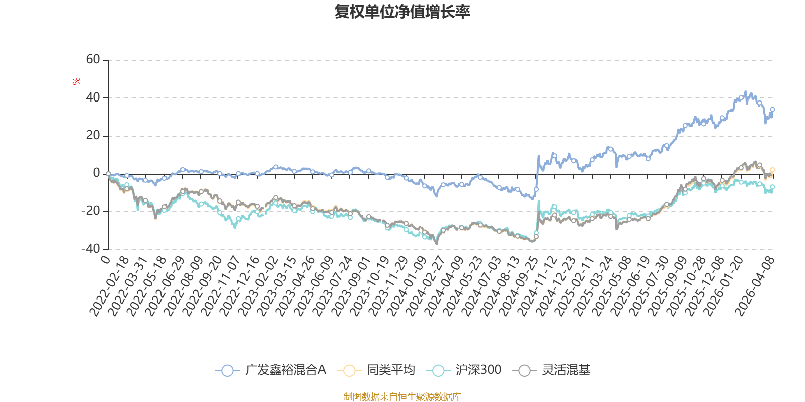 截至4月8日,广发鑫裕混合A近三个月复权单位净值增长率为-2.66%,位于同类可比基金928/1287;近半年复权单位净值增长率为3.58%,位于同类可比基金578/1286;近一年复权单位净值增长率为27.35%,位于同类可比基金771/1286;近三年复权单位净值增长率为30.37%,位于同类可比基金339/1286。
