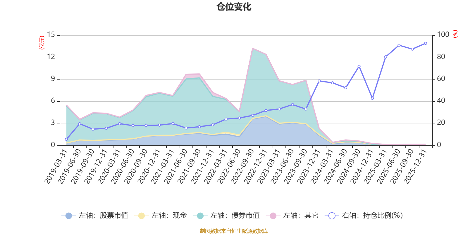 据定期报告数据统计,近三年平均股票仓位为61.26%,同类平均为72.57%。2025年末基金达到92.54%的最高仓位,2019年一季度末最低,为5.35%。