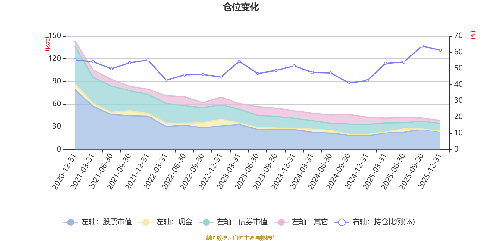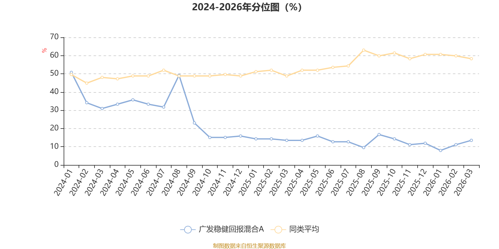 据定期报告数据统计,近三年平均股票仓位为51.08%,同类平均为67.52%。2025年三季度末基金达到63.92%的最高仓位,2024年三季度末最低,为41.19%。