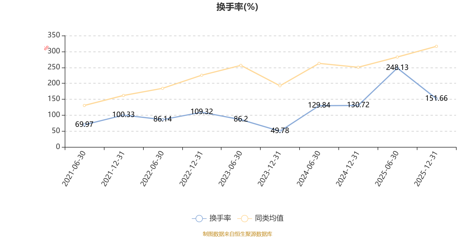 截至2025年12月31日,基金最近一年换手率约396.19%,持续低于同类均值。